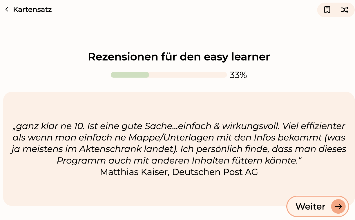 Die technische Umsetzung dieser Methode bildet die browserbasierte Plattform easy learner. Sie ermöglicht es, Lernimpulse automatisiert zu versenden, Wissen zu überprüfen und Lernfortschritte sichtbar zu machen – flexibel einsetzbar für Trainings, Unternehmen, Bildungseinrichtungen und persönliche Entwicklung.
